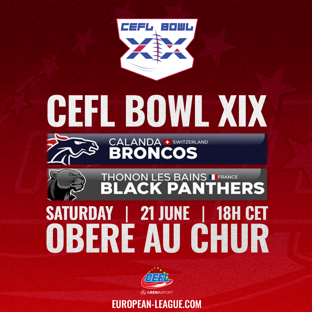 Die CEFL-Meisterschaft 2025 wird am Samstag, den 21. Juni 2025, mit ihrer Krönung abgeschlossen. Der CEFL Bowl XIX wird um 18:00 Uhr von Calanda Broncos in ihrem neuen Stadion Obere Au in Chur ausgerichtet und alle sind herzlich willkommen.